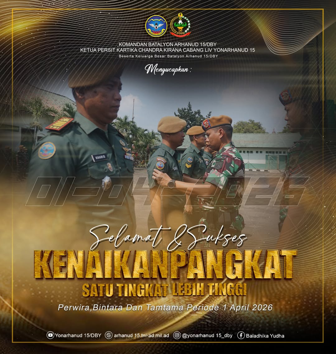 Selamat dan Sukses Atas kenaikan pangkat satu tingkat lebih tinggi dari pangkat sebelumnya kepada Perwira, Bintara dan Tamtama Batalyon Arhanud 15/DBY Periode 1 April 2026