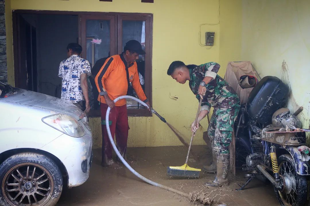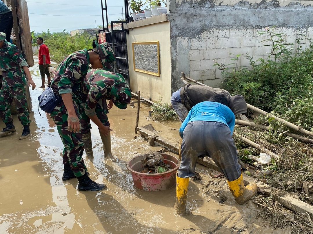 Semarang. Potret Kebersamaan Prajurit Batalyon Arhanud 15/DBY, para relawan dan warga masyarakat perumahan Griya Rowosari Permai dan Pengkol Rowosari Tembalang yang mengerahkan segenap tenaga guna membersihkan sisa-sisa bencana banjir bandang yang menimpah wilyah Tembalang Kota Semarang dengan membersihkan rumah warga serta jalan sebagai akses utama untuk kegiatan masyarakat. Senin, 9/12/2022.