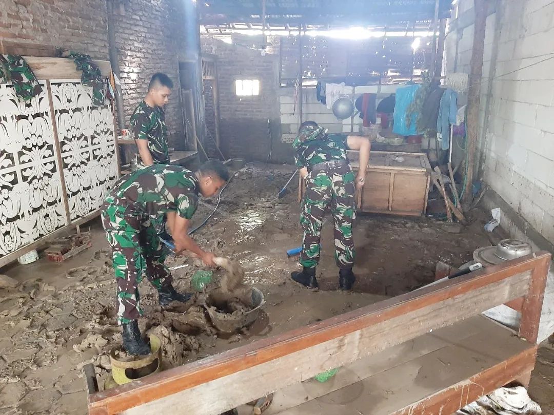 Ditempat yang berbeda Puluhan Prajurit Batalyon Arhanud 15/DBY juga malaksanakan Gotong Royong bersihkan rumah akibat banjir yang ada di Griya Rowosari Permai Meteseh Tembalang, Kota Semarang. Sabtu (07/01/2022)