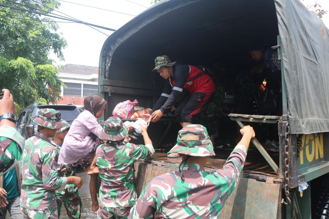 Semarang. Banjir masih merendam wilayah Kecamatan Genuk Kota Semarang. Prajurit Yonarhanud 15/DBY bersama Babinsa Koramil 06/Genuk kembali melakukan proses evakuasi warga yang terkena dampak banjir. Selasa, 3/1/2023 Yonarhanud 15/DBY menurunkan armada Truk Reo yang bergerak masuk ke sejumlah titik di Kecamatan Genuk Semarang yang terendam banjir untuk melakukan pertolongan dan evakuasi warga ke tempat yang lebih aman . Warga lanjut usia, anak-anak, dan kaum perempuan menjadi utama dalam evakuasi tersebut.