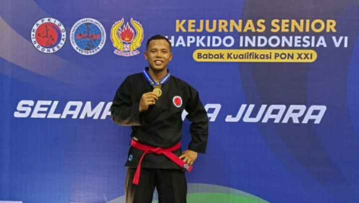 Yogyakarta. Mewakili Provinsi Jawa Tengah, Pratu Giantoro, Takawud 4 Pokorai B Yonarhanud 15/DBY Kodam IV/Diponegoro berhasil meraih medali emas kelas over 84 kg putra dalam Kejurnas Senior Hapkido Indonesia VI 2023 yang digelar di Daerah Istimewa Yogyakarta. Minggu, 23/7/2023.