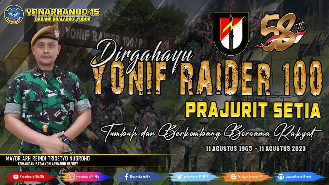 Keluarga Besar Batalyon Arhanud 15/DBY Mengucapkan Dirgahayu Yonif Raider 100/PS