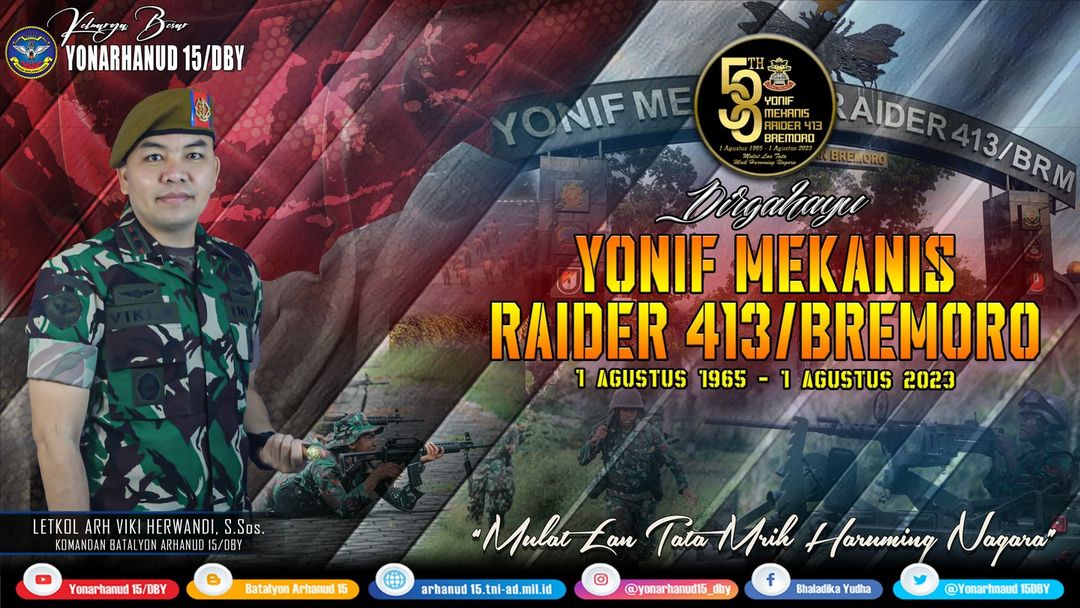 Keluarga Besar Batalyon Arhanud 15/DBY Mengucapkan Dirgahayu Yonif Mekanis Raider 413/Bremoro