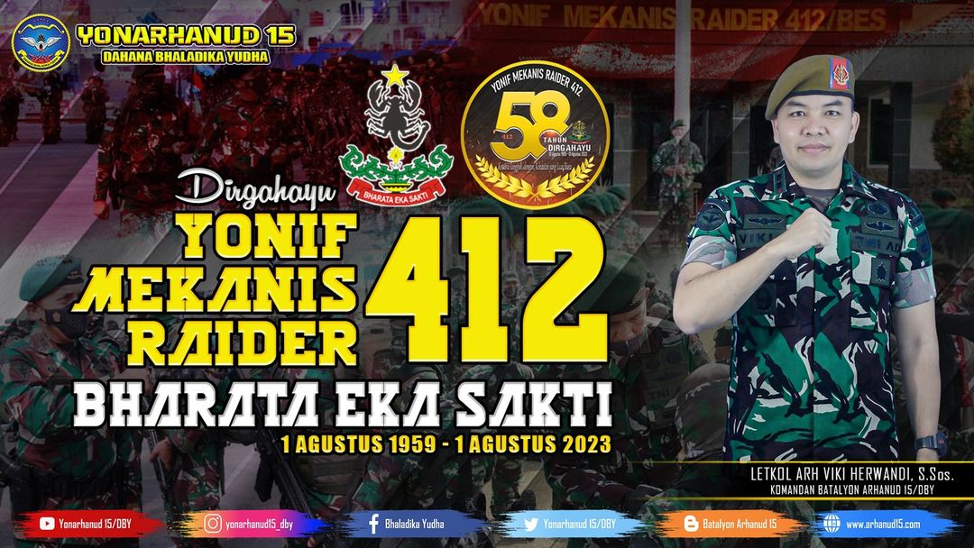 Keluarga Besar Batalyon Arhanud 15/DBY Mengucapkan Dirgahayu Yonif Mekanis Raider 412/BES