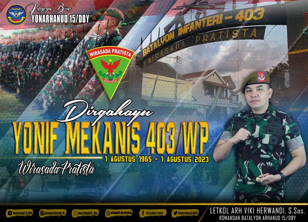 Keluarga Besar Batalyon Arhanud 15/DBY Mengucapkan Dirgahayu Yonif Mekanis 403/Wirasada Pratista