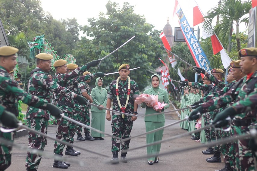 Komandan Batalyon Arhanud 15/DBY Letkol Arh Viki Herwandi, S.Sos. didampingi Ketua Persit KCK Cabang LIV Yonarhanud 15 Ny. Laura Viki Herwandi bersama-sama seluruh Prajurit Yonarhanud 15/DBY menyambut kedatangan calon Komandan Batalyon yang baru Mayor Arh Reindi Trisetyo Nugroho di Markas Komando Batalyon Arhanud 15/DBY, Senin 2 Agustus 2023.