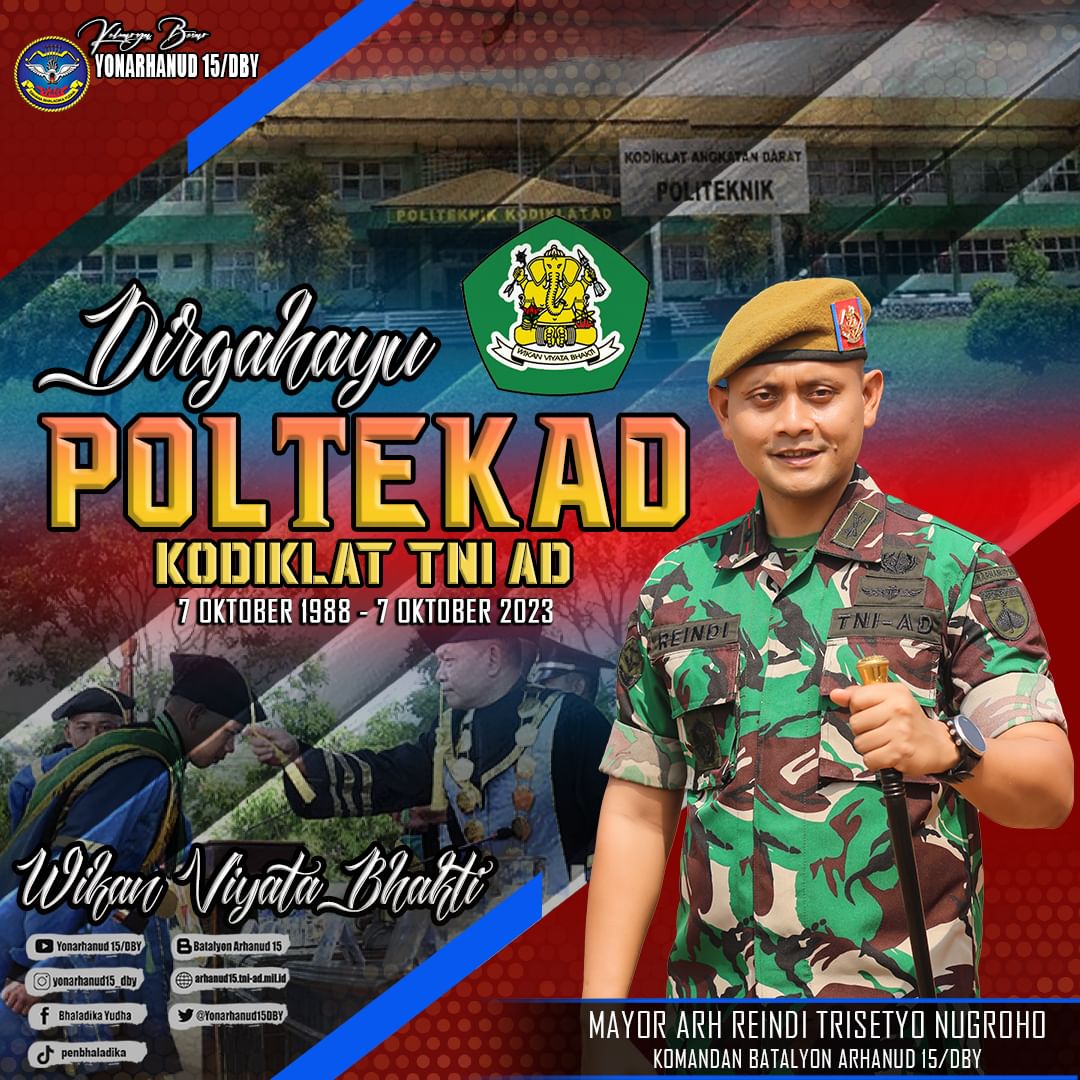 Dirgahayu Poltekad Kodiklat TNI AD Oktober 16, 2023 adminarh15 Keluarga Besar Batalyon Arhanud 15/DBY Mengucapkan Dirgahayu Poltekad Kodiklat TNI AD