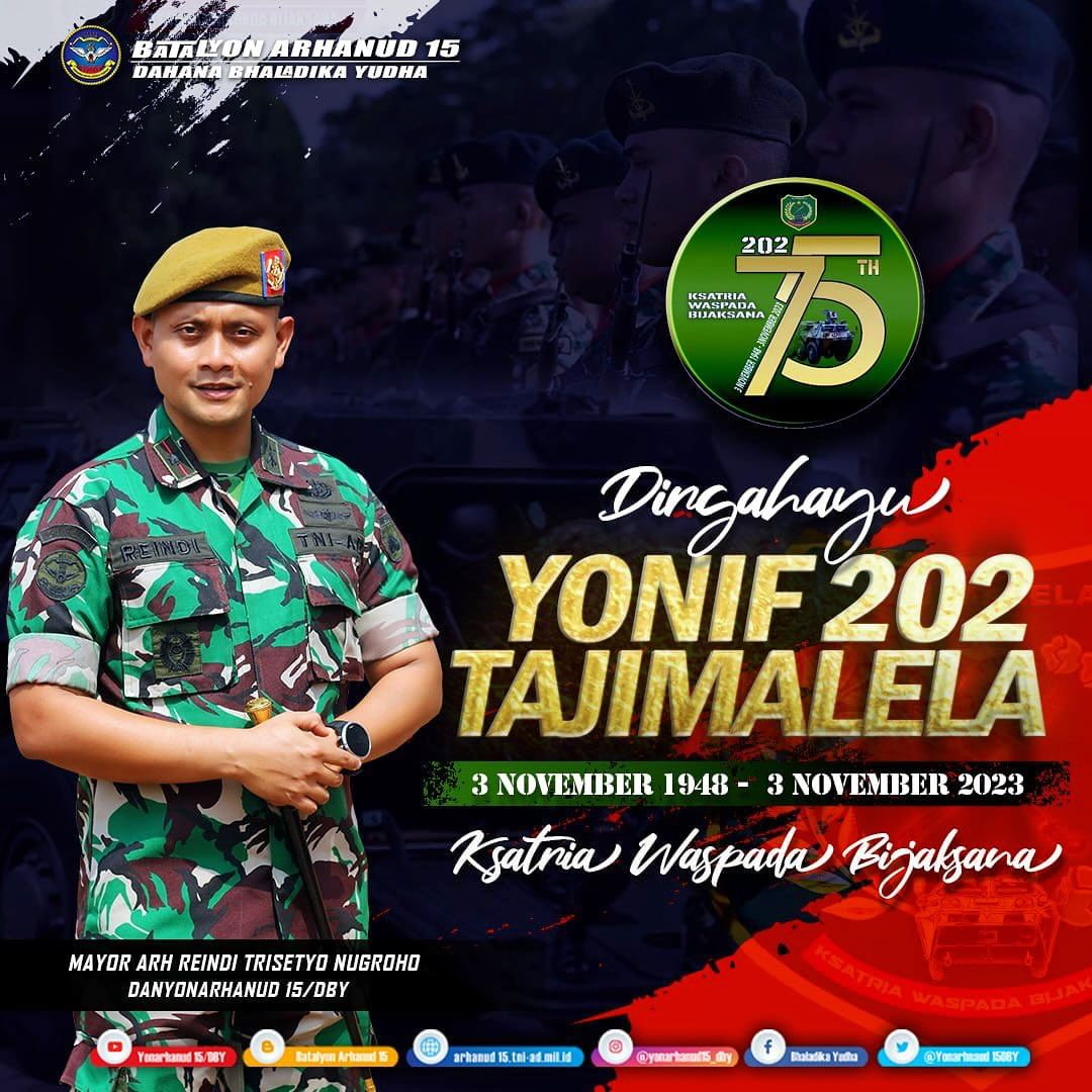 Dirgahayu Yonif 202/Tajimalela November 20, 2023 adminarh15 Dirgahayu Ke-75 YONIF 202/TAJIMALELA “Ksatria Waspada Bijaksana” 3 November 1948 – 3 November 2023