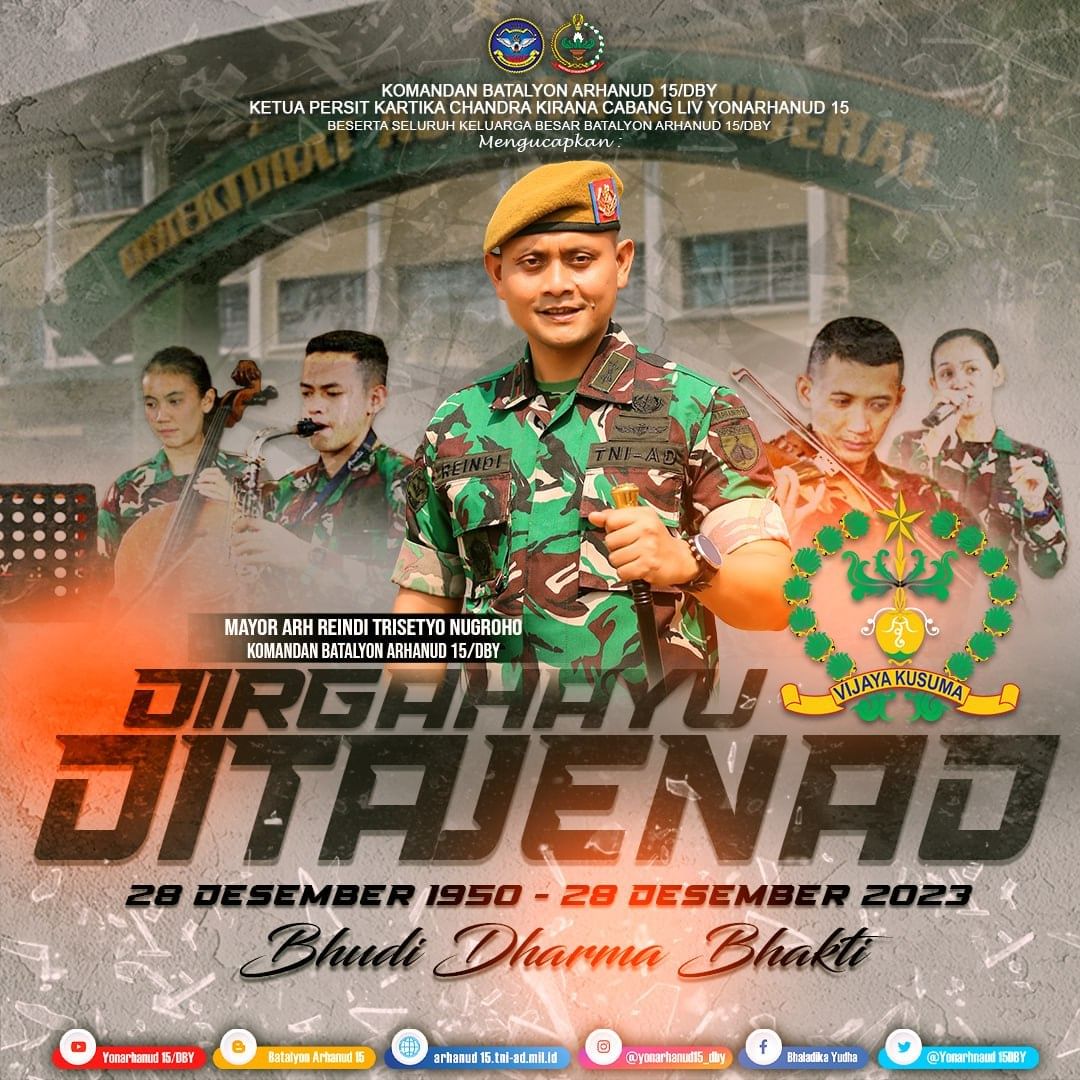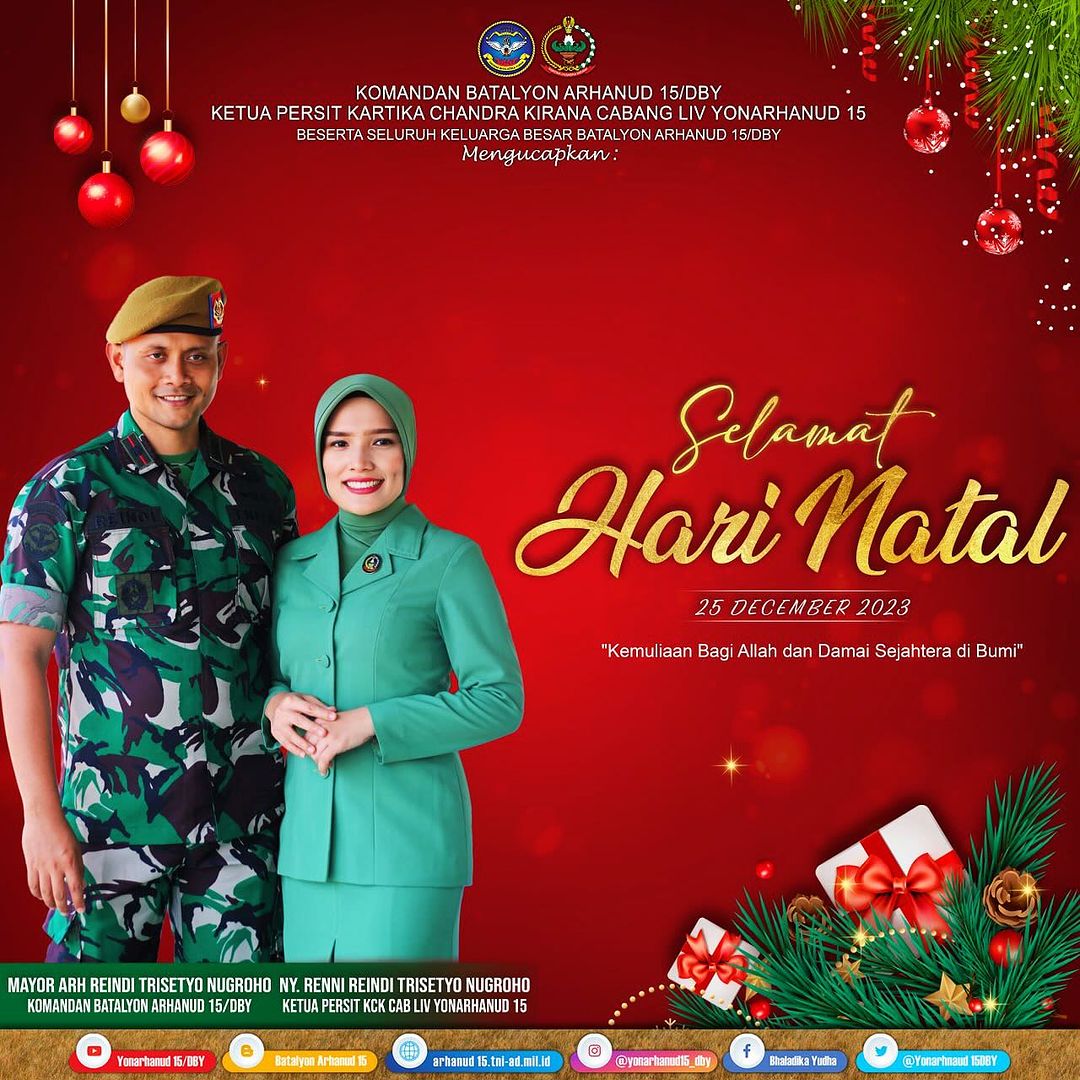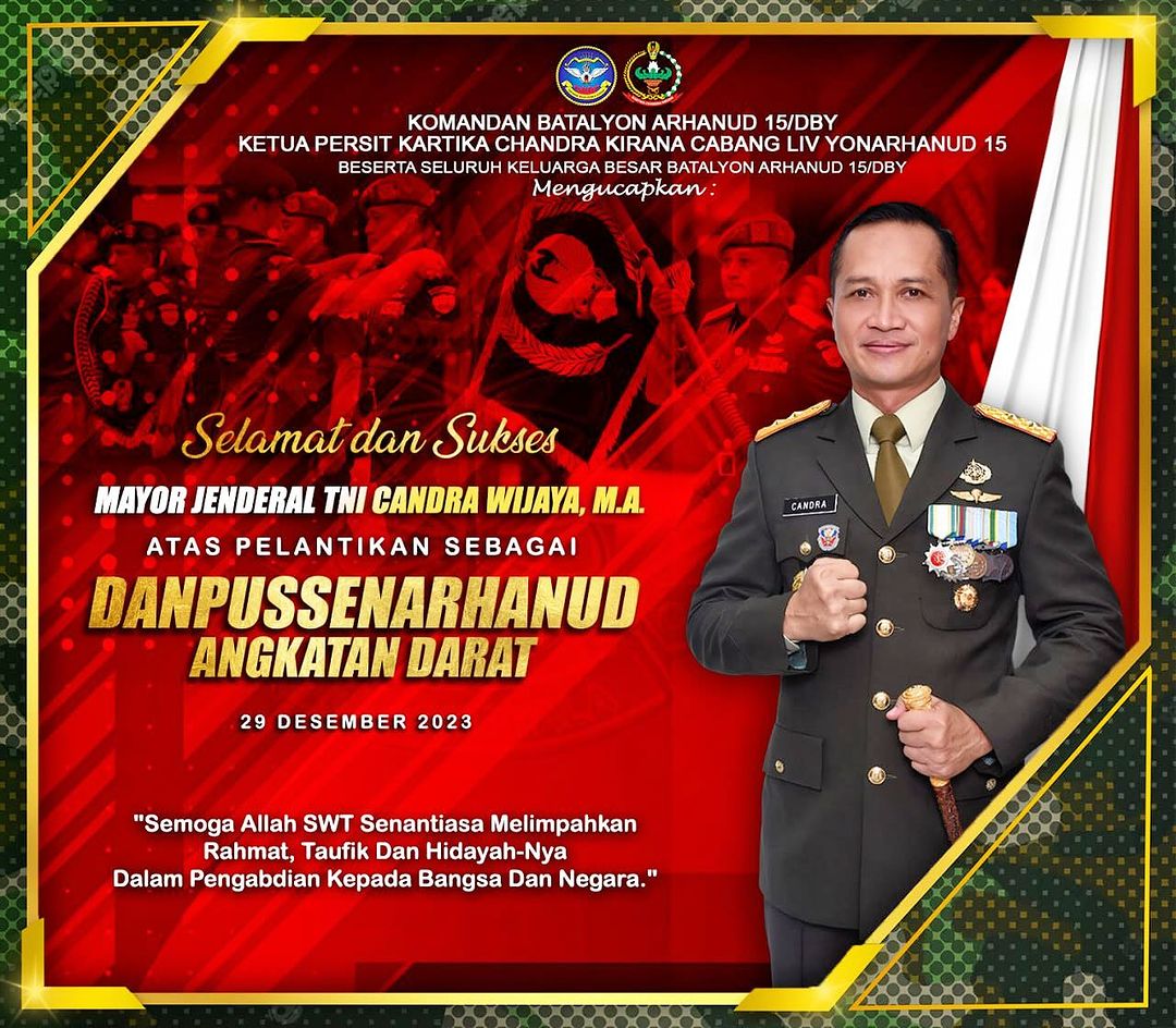 Komandan Batalyon Arhanud 15/DBY dan Ketua Persit Kartika Candra Kirana Cabang LIV Yonarhanud 15 Beserta Segenap Keluarga Besar Batalyon Arhanud 15/DBY, Mengucapkan Selamat dan Sukses Atas Pelantikan Mayor Jendral TNI Candra Wijaya, M.A. Sebagai Danpussenarhanud Angkatan Darat “Semoga Allah SWT Senantiasa Melimpahkan Rahmat, Taufik Dan HIdayah-Nya Dalam Pengabdian Kepala Bangsa Dan Negara.”
