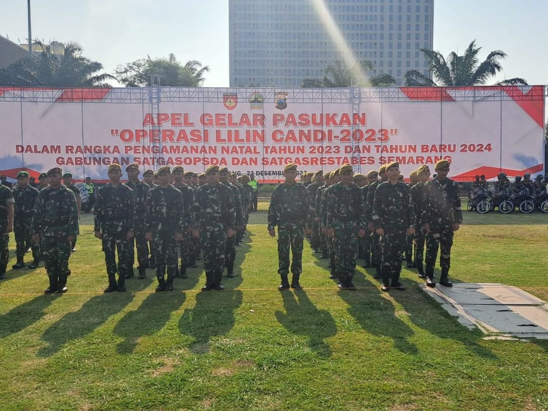 Semarang. Puluhan Personel Batalyon Arhanud 15/DBY mengikuti Apel Gelar Pasukan Operasi Lilin Candi 2023 dalam rangka pengamanan Perayaan Natal Tahun 2023 dan Tahun Baru 2024 Gabungan Satgasopsda dan Satgasrestabes Semarang di Lapangan Pancasila Simpang Lima Kota Semaarang. Jumat (22/12/2023)
