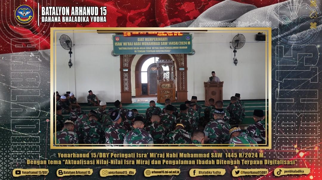 Dengan Tema “Aktualisasi Nilai-nilai Isra Miraj dan Pengalaman Ibadah Ditengah terpaan Digitalisasi”, Yonarhanud 15/DBY Peringati Isra’ Mi’raj Nabi Muhammad SAW 1445 H/2024 M. Semarang, Diawali dengan pembacaan ayat suci Alqur’an dan dilanjutkan sambutan oleh Komandan Batalyon Arhanud 15/DBY Mayor Arh Reindi Trisetyo Nugroho selaku Pembina takmir masjid Alqubro Bhaladika, peringatan Isra Mi’raj merupakan momen untuk Menjadikan Prajurit Bermoral dan bermental Tangguh serta meningkatkan keimanan dan ketakwaan warga Batalyon Arhanud 15/DBY. Selasa, (06/2/24). jika berbicara mengenai isra’ mi’raj ada beberapa poin penting yang harus kita ingat, demikian ucap Ust. M. Rifqi,…