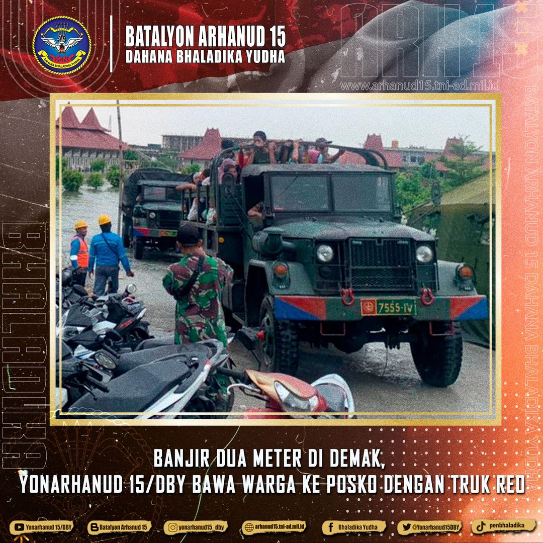Yonarhanud 15/DBY menurunkan armada Truk Reo yang bergerak masuk ke sejumlah titik di Kecamatan Karanganyar yang terendam banjir untuk melakukan pertolongan dan evakuasi warga ke tempat yang lebih aman. Warga lanjut usia, anak-anak, dan kaum perempuan menjadi utama dalam evakuasi tersebut.