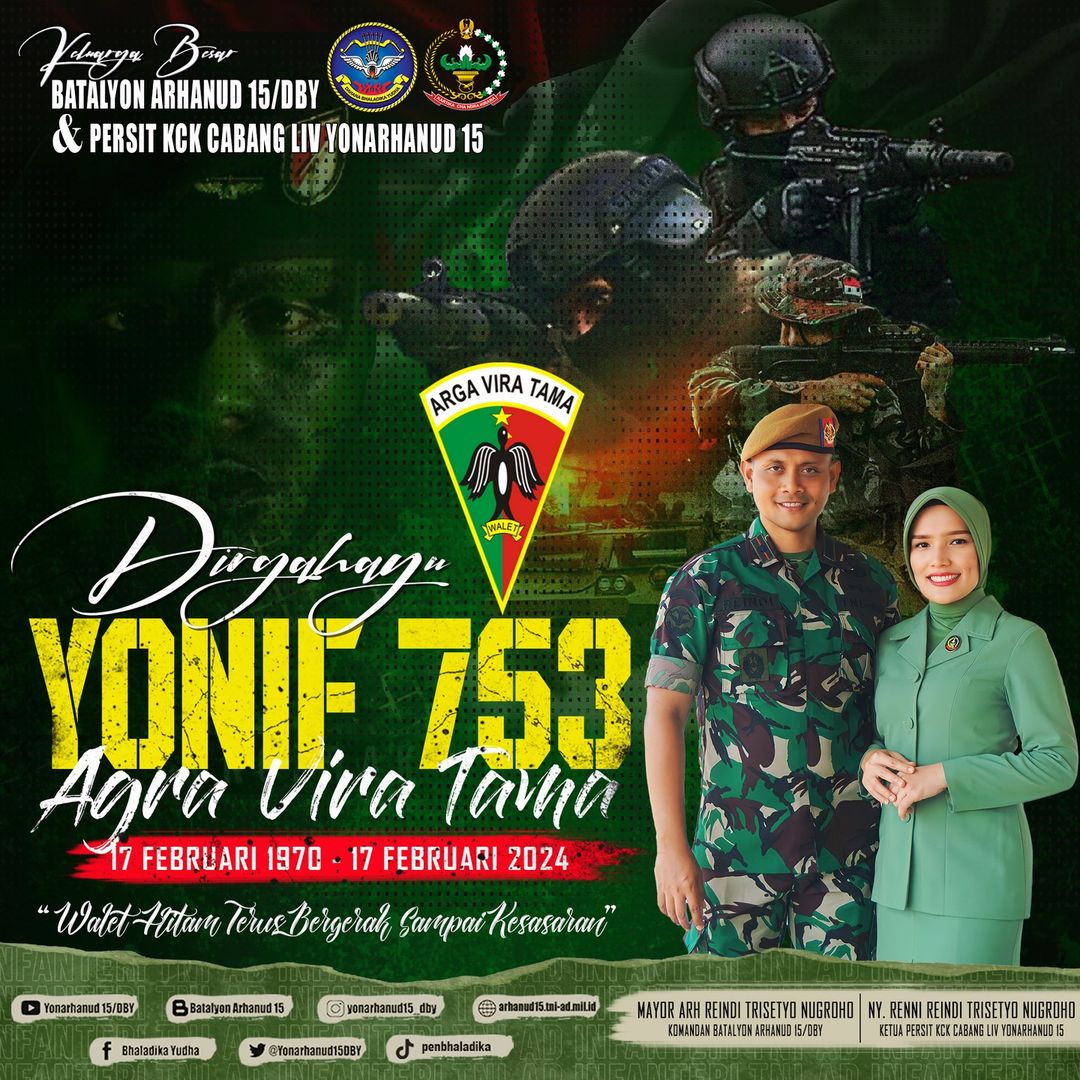 Dirgahayu Yonif 753/AVT Maret 9, 2024 adminarh15 DIRGAHAYU YONIF 753/AVT 17 FEBRUARI 1970 – 13 FEBRUARI 2024 “Walet Hitam Terus Bergerak Sampai Kesasaran“