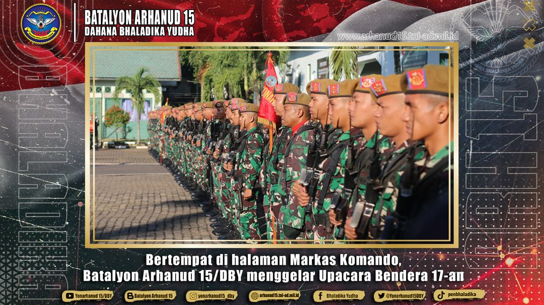 Semarang. Bertempat di halaman Markas Komando (Mako), Batalyon Arhanud 15/DBY menggelar Upacara Bendera 17-an Senin (19/2/2024) Bertindak sebagai Irup dalam upacara tersebut Wakil Komandan Batalyon Arhanud 15/DBY Mayor Arh Mohammad Arif Yudianto dan Komandan Upacara Danrai B Yonarhanud 15/DBY, Lettu Arh Didik Suprapto. Upacara diikuti oleh seluruh prajurit Yonarhanud 15/DBY, berlangsung tertib dan hikmad. Dalam amanat Kepala Staf Angkatan Darat Jenderal TNI Maruli Simanjuntak, M.Sc., yang dibacakan berpesan agar kita tidak boleh terlena karena tahapan Pemilu masih panjang sampai dengan Pelantikan Presiden dan Wakil Presiden yang rencana dilaksanakan pada bula…