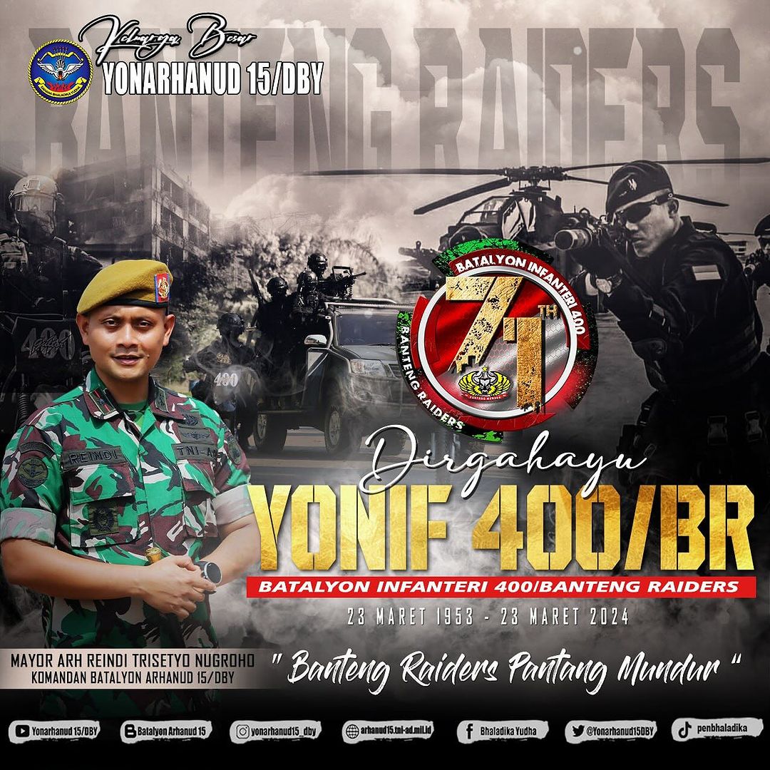 DIRGAHAYU KE-71 TH YONIF 400/BR 23 MARET 1953 – 23 MARET 2024 BANTENG RAIDERS PANTANG MUNDUR