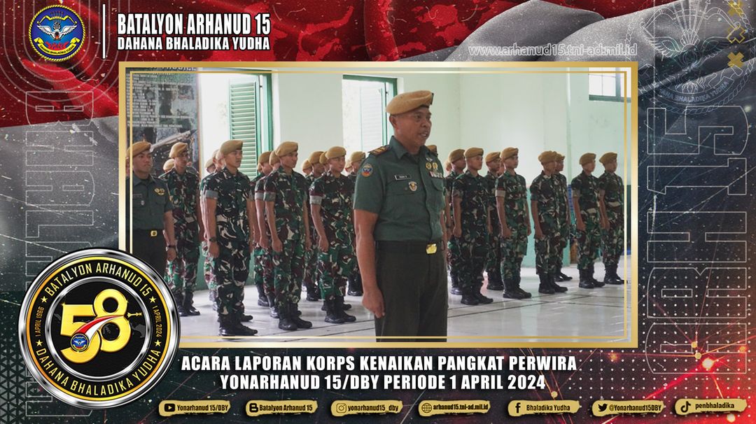 Bertempat di Aula Glatik, Komandan Batalyon Arhanud 15/DBY, Letkol Arh Reindi Trisetyo Nugroho memimpin langsung acara laporan korps kenaikan pangkat Perwira Yonarhanud 15/DBY periode 1 April 2024. Senin (1/4/2024)