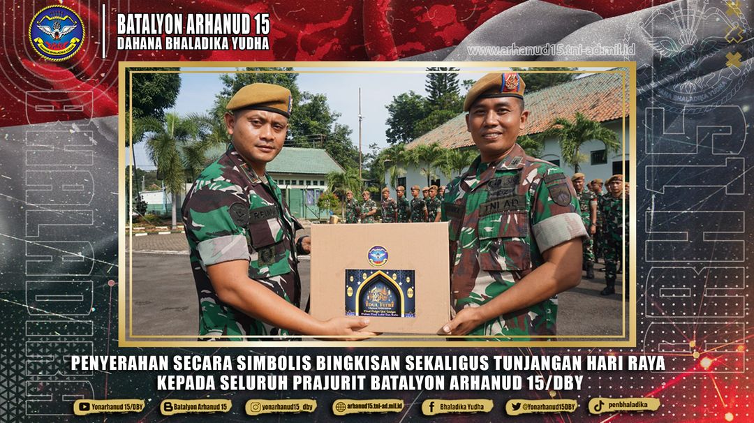 Komandan Batalyon Arhanud 15/DBY Letkol Arh Reindi Trisetyo Nugroho menyerahkan secara simbolis bingkisan sekaligus tunjangan hari raya (THR) kepada seluruh prajurit Batalyon Arhanud 15/DBY bertempat di Mako Yonarahnud 15/DBY. Jumat (5/4/2024) Kegiatan tersebut sudah menjadi tradisi satuan guna menyambut datangnya hari rayal idul fitri 1445 H, kegiatan ini sebagai bentuk kepedulian dan tali asih pimpinan kepada bawahan dalam bentuk satu kesatuan, sekaligus memelihara moril, semangat serta dapat dimanfaatkan seluruh prajurit dalam menyambut hari raya Idul Fitri. Komandan Batalyon Arhanud berpesan kepada seluruh prajurit agar bingkisan tersebut dapat dimanfaatkan pada saat…