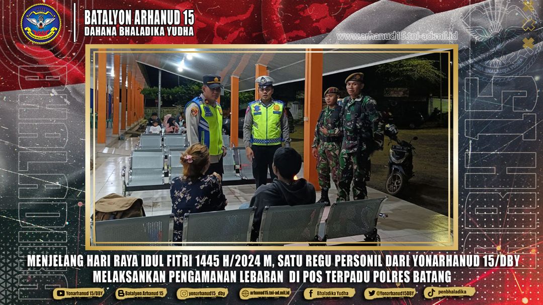 Batang. Menjelang Hari Raya Idul Fitri 1445 H/2024 M, satu regu personil pengamanan lebaran dari Yonarhanud 15/DBY yang dipimpin oleh Sertu Dikmanto ditempatkan di Pos Terpadu Polres Batang untuk membatu kelancaran dan keamanan pemudik yang melintas dijalur tersebut. Senin, 8/4/2024.