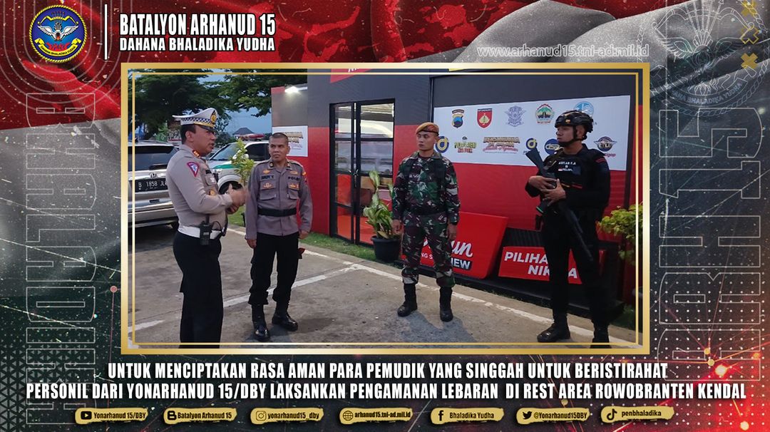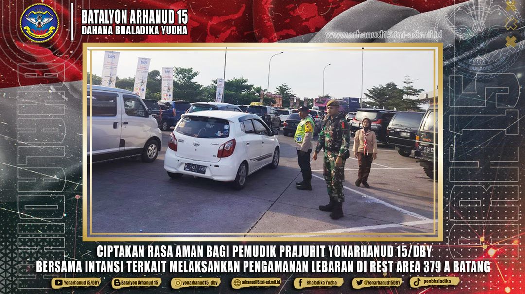Batang. Bersama Instansi terkait lainnya, personil Yonarhanud 15/DBY melaksanakan pengamanan lebaran disejumlah titik di Rest Area wilayah Jawa Tengah, diantaranya di Rest Area 379 A Batang untuk menciptakan rasa aman bagi pemudik yang melintas dijalur tersebut serta menjaga kelancaran dalam berkendara. Minggu