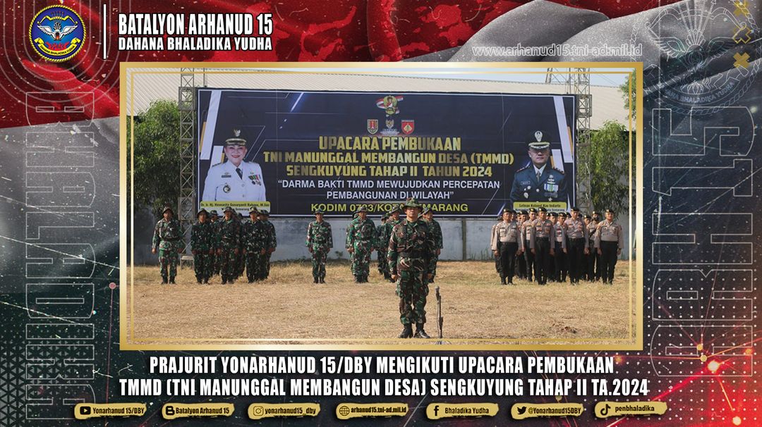 Semarang – Satu Peleton Prajurit Yonarhanud 15/DBY mengikuti Upacara Pembukaan kegiatan Operasi Bakti TMMD (TNI Manunggal Membangun Desa) yang dilaksanakan di Kelurahan Kaligawe, Kecamatan Gayamsari pada, Rabu (8/5/2024). Kegiatan ini merupakan wujud nyata kemanunggalan TNI dengan rakyat dalam upaya percepatan pembangunan di daerah pedesaan serta meningkatkan infrastruktur dan kesejahteraan masyarakat. Sasaran fisik TMMD Sengkuyung Tahap II Tahun 2024 Melalui kegiatan ini, TNI menginisiasi pembangunan infrastruktur fisik seperti talud, pavingisasi jalan, rehab Rumah Tidak Layak Huni (RTLH) serta turut mendukung ketahanan pangan di wilayah setempat. Kegiatan TMMD yang dilaksanakan mulai 8…