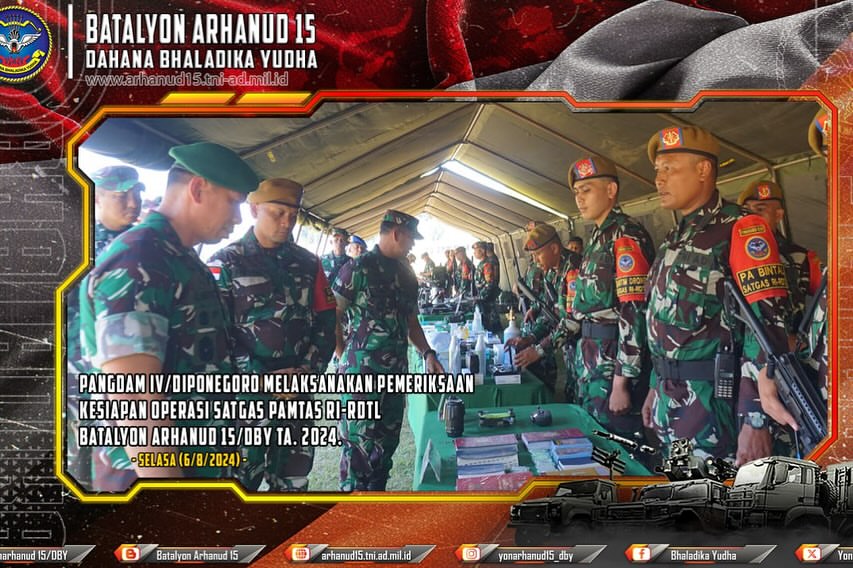 Semarang – Pangdam IV/Diponegoro Mayjen TNI Deddy Suryadi, S.I.P., M.Si., melaksanakan Pemeriksaan Kesiapan Operasi (Riksiapops) Tingkat Kotama Satgas Pamtas RI-RDTL Batalyon Arhanud 15/DBY TA. 2024. Riksiapops tersebut digelar di Lapangan Bhaladika Yonarahnaud 15/DBY, jatingaleh, Kecamatan Candisari, Kota Semarang, Provinsi Jawa Tengah, pada Senin (19/8/2024). Pangdam IV/Diponegoro menekankan pentingnya profesionalisme dalam menjalankan tugas. Selain itu keamanan harus tetap menjadi prioritas utama dalam setiap operasi, baik dalam skala kecil maupun besar. “Ketika melaksanakan kegiatan patroli, kecil maupun besar, tetap harus waspada dan menjaga keamanan. Serta pentingnya niat yang kuat dalam menjalankan tugas…