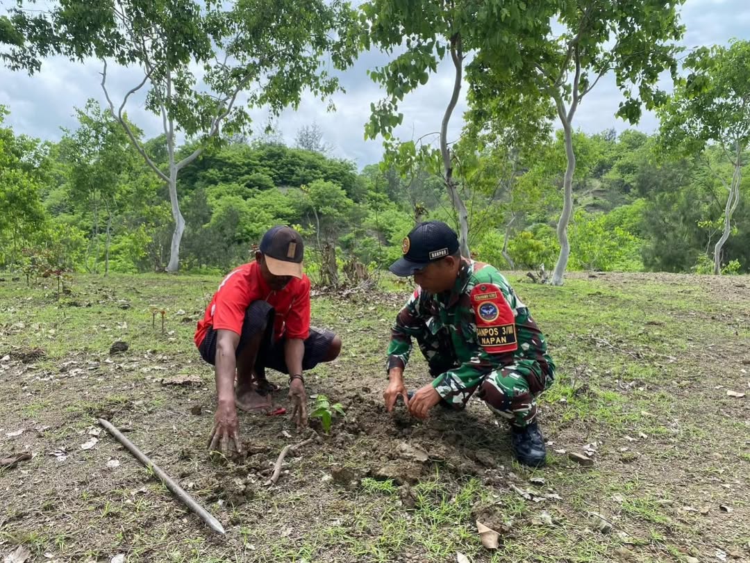 Napan, 21 Desember 2024 – Satgas Pengamanan Perbatasan (Pamtas) RI-Timor Leste (RDTL) Yonarhanud 15/DBY Pos Napan yang dipimpin oleh Danpos Letda Arh Sulistyohadi menggelar kegiatan penanaman pohon di kawasan Gunung Putih, Desa Napan, wilayah perbatasan Indonesia dengan Timor Leste. Kegiatan ini melibatkan partisipasi aktif masyarakat setempat.