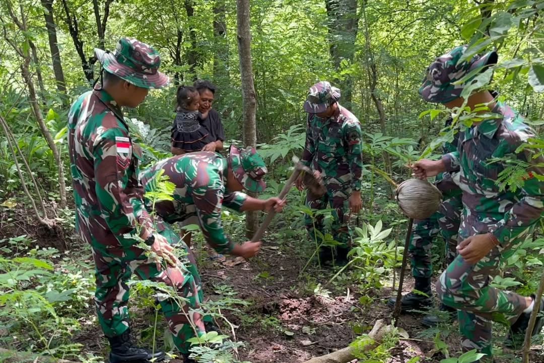 Satgas Pamtas RI-RDTL Sektor Barat Yonarhanud 15/DBY Tanam Bibit Pohon Kelapa di Rumah Warga Desa Inbate