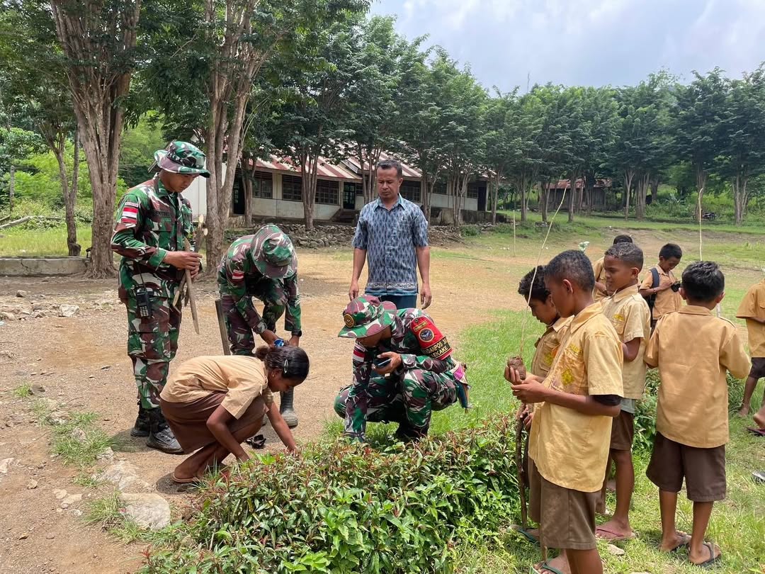 Mutis, 1 Maret 2025 – Dalam rangka menjaga kelestarian lingkungan di wilayah perbatasan, Satgas Pamtas RI-RDTL Sektor Barat Yonarhanud 15/DBY Pos Naekake melaksanakan kegiatan penanaman pohon di Desa Naekake A, Kecamatan Mutis, Kabupaten Timor Tengah Utara (TTU). Kegiatan ini dipimpin oleh Wadan Pos Serda Hermantoro bersama tujuh anggota Pos Naekake. Penanaman pohon dilakukan di berbagai lokasi strategis, termasuk Paroki St. Bernadus Naekake, SD Katolik Noelelok 21, serta halaman rumah warga seperti Mama Akulina, Mama Yos, Mama Denis, Om Iyan, Om Frid, dan Bapak Tarsih Raja Naekake. Jenis pohon yang ditanam…