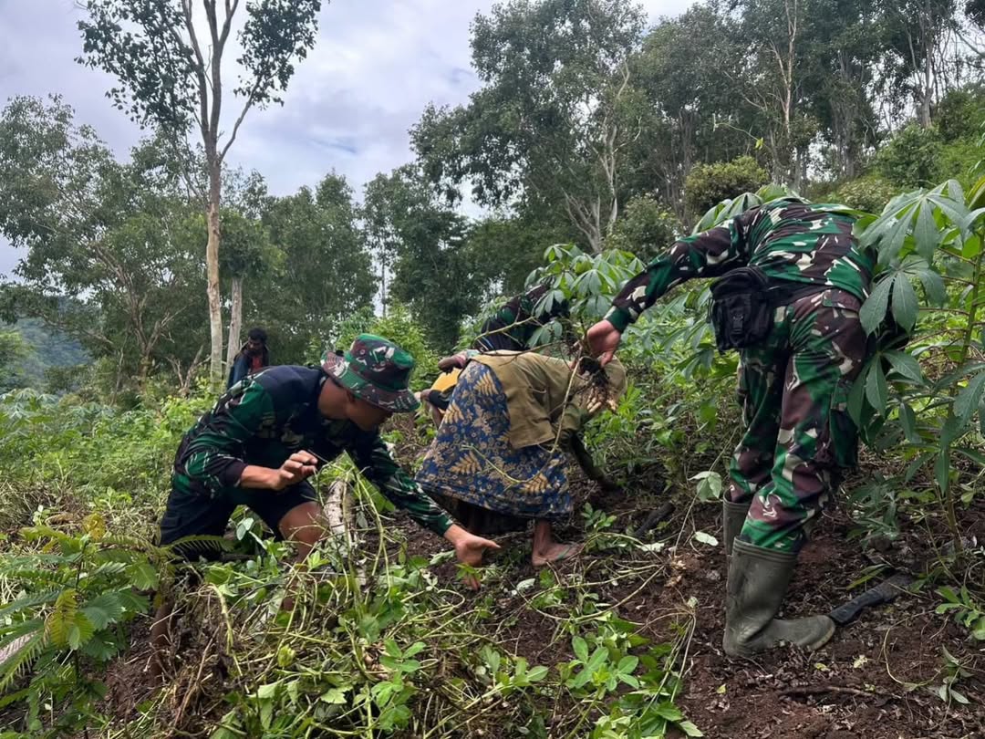 TTU, 14 Mei 2025 — Satgas Pamtas RI-RDTL Sektor Barat Yonarhanud 15/DBY kembali menunjukkan kepeduliannya kepada masyarakat perbatasan. Kali ini, personel Pos Nelu yang dipimpin oleh Wadanpos Sertu Dikmanto bersama lima anggota melaksanakan kegiatan karya bakti membantu panen kacang tanah di kebun milik Mama Novi, warga Dusun Nelu RT 12/RW 06, Desa Sunsea, Kecamatan Naibenu, Kabupaten Timor Tengah Utara.