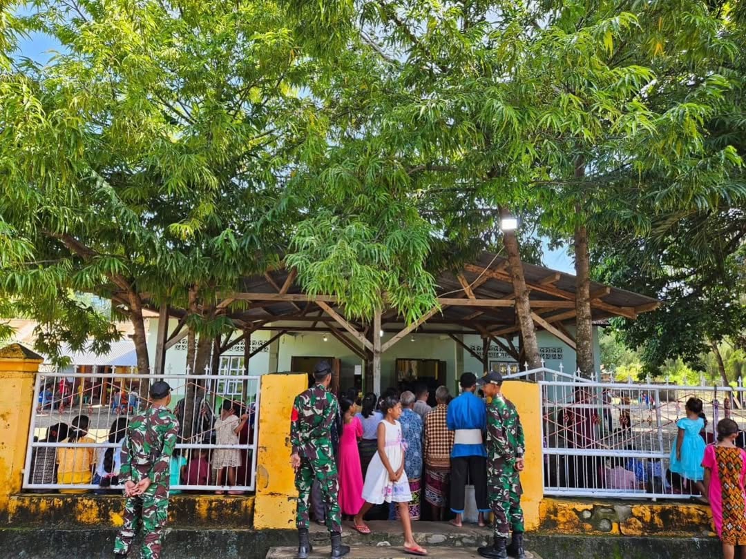 Tak hanya di wilayah Amfoang, personel dari Pos Aplal juga turut melaksanakan pengamanan ibadah di Gereja Stasi Aplal, Dusun Lasena, Desa Tasinifu, Kecamatan Mutis, Kabupaten Timor Tengah Utara (TTU), yang dipimpin oleh Serda Fadlurahman bersama dua anggota pos.
