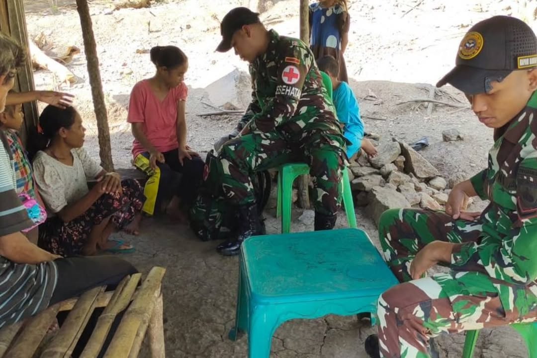 Sementara itu, di tempat terpisah, Serda Zidni Firmansyah bersama tim kesehatan pos juga melaksanakan pelayanan kesehatan kepada anak dari Mama Yudita Elu (60) di Dusun Kampung Lama, Desa Tes, RT 01/RW 03. Pemeriksaan dilakukan karena adanya keluhan sakit akibat perubahan cuaca.