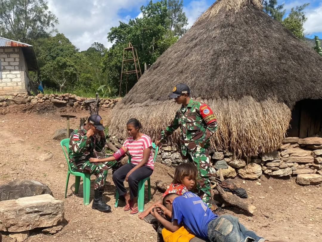 29 Juli 2025, Oelbinose – Satgas Pamtas RI – RDTL sektor barat yonarhanud 15/DBY melaksanakan kegiatan Kesehatan Keliling di Dusun Oelbinose, Desa Tasinifu, Kecamatan Mutis, yang dipimpin oleh Wadanpos Oelbinose, Sertu Achmad Alfian Amila, bersama satu anggota Takes Oelbinose.