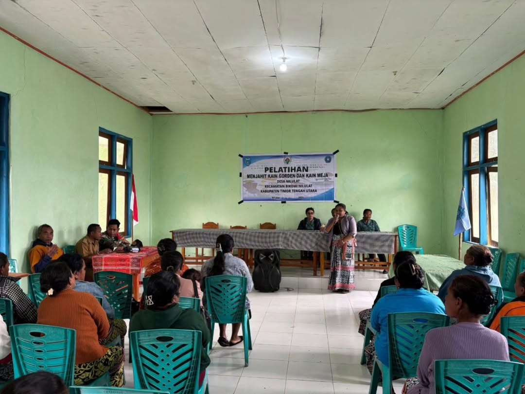 Selasa, 15 Juli 2025 – Satgas Pamtas RI – RDTL sektor barat yonarhanud 15/DBY melaksanakan kegiatan pelatihan dan pembekalan ketrampilan menjahit kain gorden dan kain meja di Desa Nilulat, Kecamatan Bikomi Nilulat, Kabupaten Timor Tengah Utara. Kegiatan tersebut dipimpin oleh Wadanpos Sertu Kukuh Dwi P. dan dihadiri oleh berbagai elemen masyarakat setempat, termasuk Camat dan perangkat kecamatan, kepala desa, serta anggota BPD.