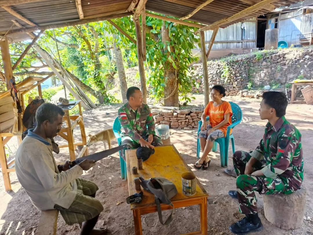 Jumat, 11 Juli 2025, Satgas Pamtas RI-RDTL Sektor Barat, Yon Arhanud 15/DBY, melaksanakan kegiatan anjangsana di rumah Bapak Mose (55), seorang petani dan pengrajin kayu, yang berlokasi di Dusun Inbate, Kecamatan Bikomi Nilulat, Kabupaten Timor Tengah Utara (TTU). Kegiatan ini dilakukan oleh tiga orang personel Pos Inbate yang dipimpin oleh Praka Zudha.