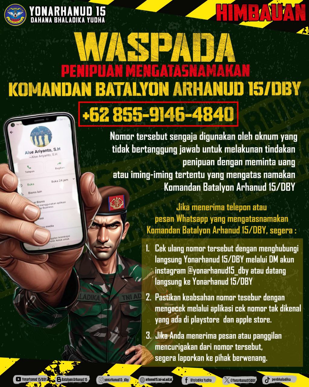 Yonarhanud 15/DBY menghimbau masyarakat Semarang dan sekitarnya untuk selalu waspada terhadap modus penipuan yang mengatasnamakan institusi kami. Jangan mudah percaya kepada pihak-pihak yang mengaku dari Komandan Batalyon Arhanud 15/DBY dan meminta uang atau memberikan iming-iming tertentu. Modus seperti ini adalah upaya penipuan yang merugikan dan mencemarkan nama baik institusi. ✅ Harap pastikan kebenaran informasi dengan menghubungi akun resmi Instagram @yonarhanud15_dby atau langsung ke Batalyon Arhanud 15/DBY Jl. Kesatrian Jatingaleh Kota Semarang🔍 Selalu lakukan verifikasi sebelum menanggapi permintaan apapun.📞 Jika Anda menerima pesan atau panggilan mencurigakan, segera laporkan ke pihak berwenang. Kami mengajak…